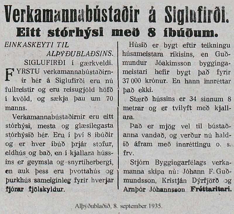 Mjölnir segir frá því 9. júní að flutt sé í verkamannabústaðina alla, í syðsta húsið um mánaðarmótin september - október s.l., í miðhúsið í desember og í nyrsta húsið í byrjun júní. Öll húsin eru eins, í hverjum enda eru fjórar þriggja herbergja íbúðir og ein tveggja herbergja í kjallara.