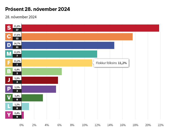 Nest kommer liberale «Viðreisn» (C)med i underkant av 20 prosent.