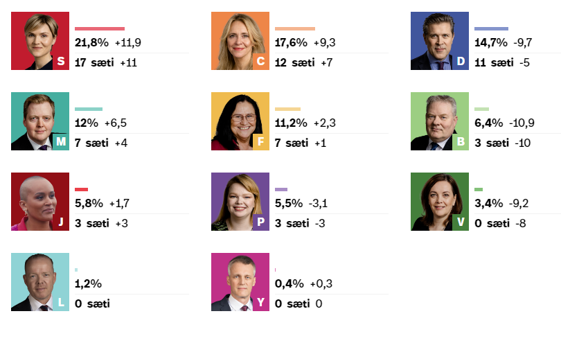 Apropos navn på partier: Det norske Senterpartiet heter Framsóknarflokkurinn (Fremskrittspartiet) på islandsk. Fremskrittspartiet i Norge har sin kopi (på mange måter) på Island i partiet Miðflokkurinn (Senterpartiet).